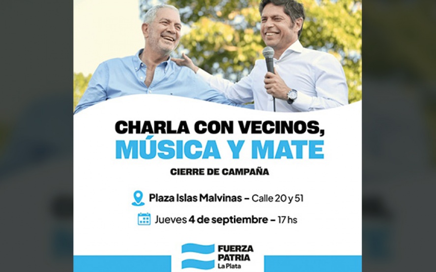 Este jueves 4 de septiembre a las 17:00, la Plaza Islas Malvinas de 20 y 51 será el epicentro del cierre de campaña de Fuerza Patria en La Plata, en el marco de una jornada que contará con música en vivo, mateada y charla con vecinos.